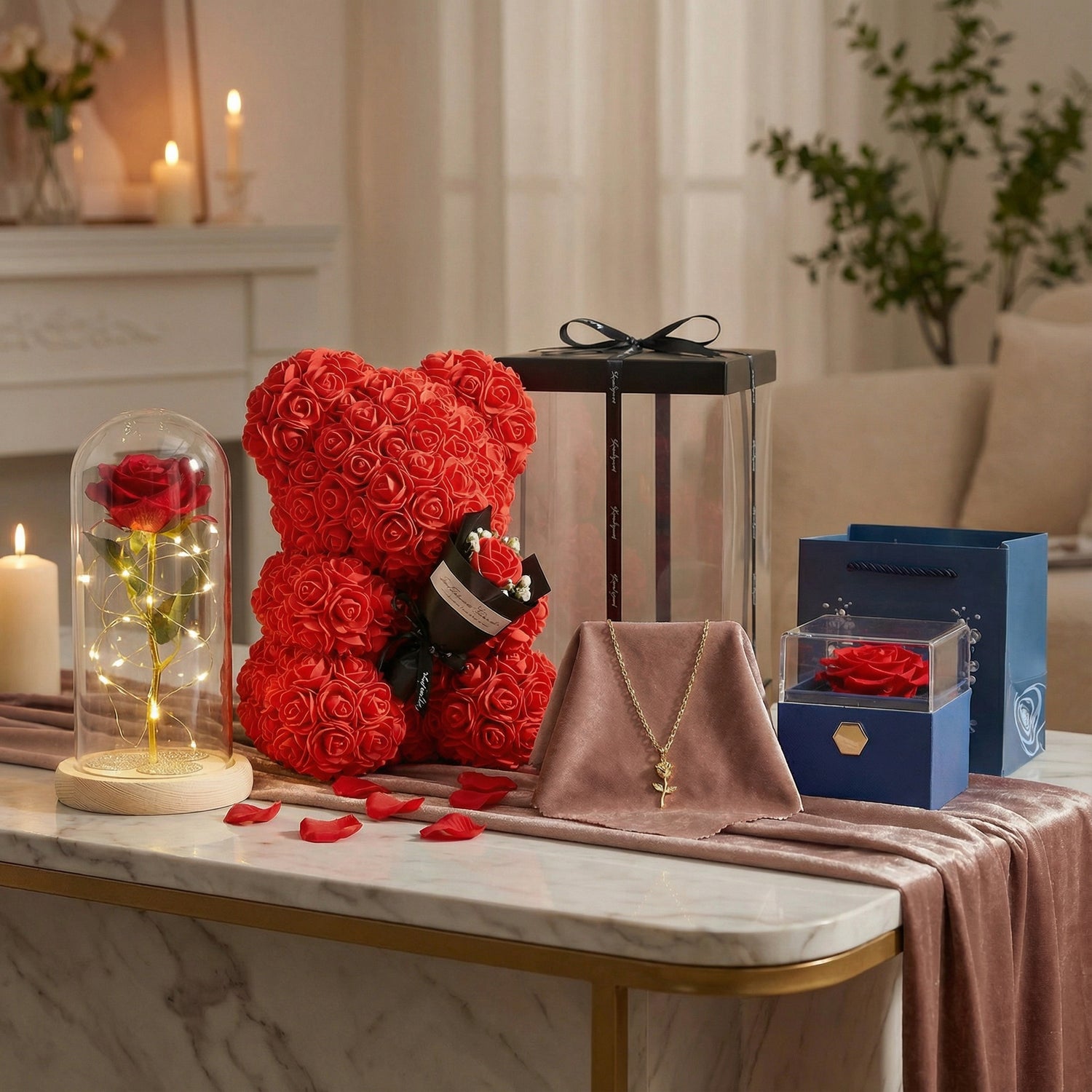 Your bundle includes a handcrafted rose lamp that lights up any room, a premium rose bear with a gift box included, and a velvet-lined rotating jewelry box that holds the gold rose pendant necklace inside. Every piece is designed to complement the others, creating one complete Valentine’s experience in a single, effortless bundle. It’s the only gift she’ll need — and the only one you’ll need to think about.